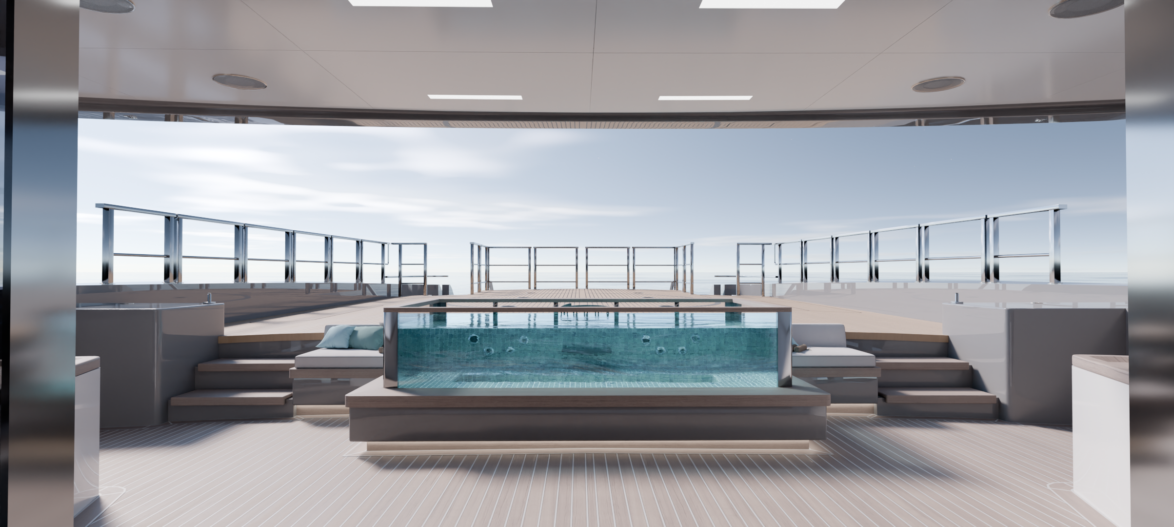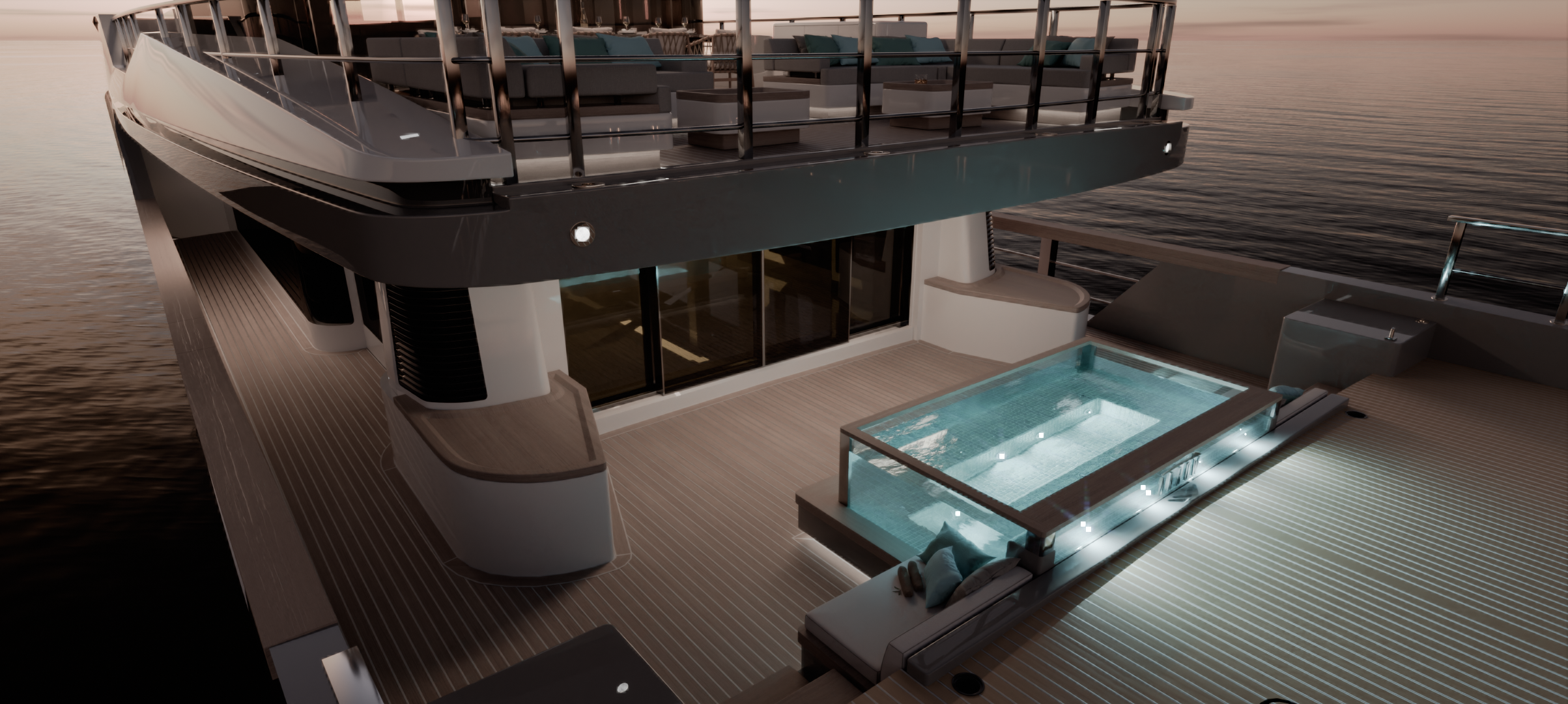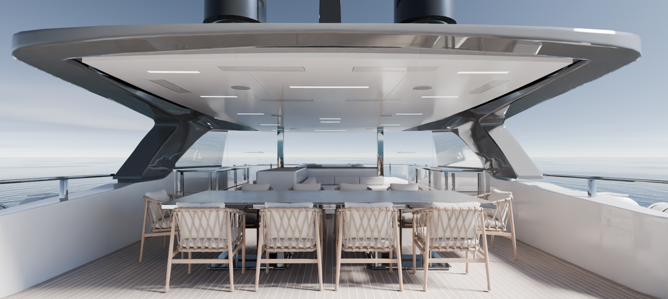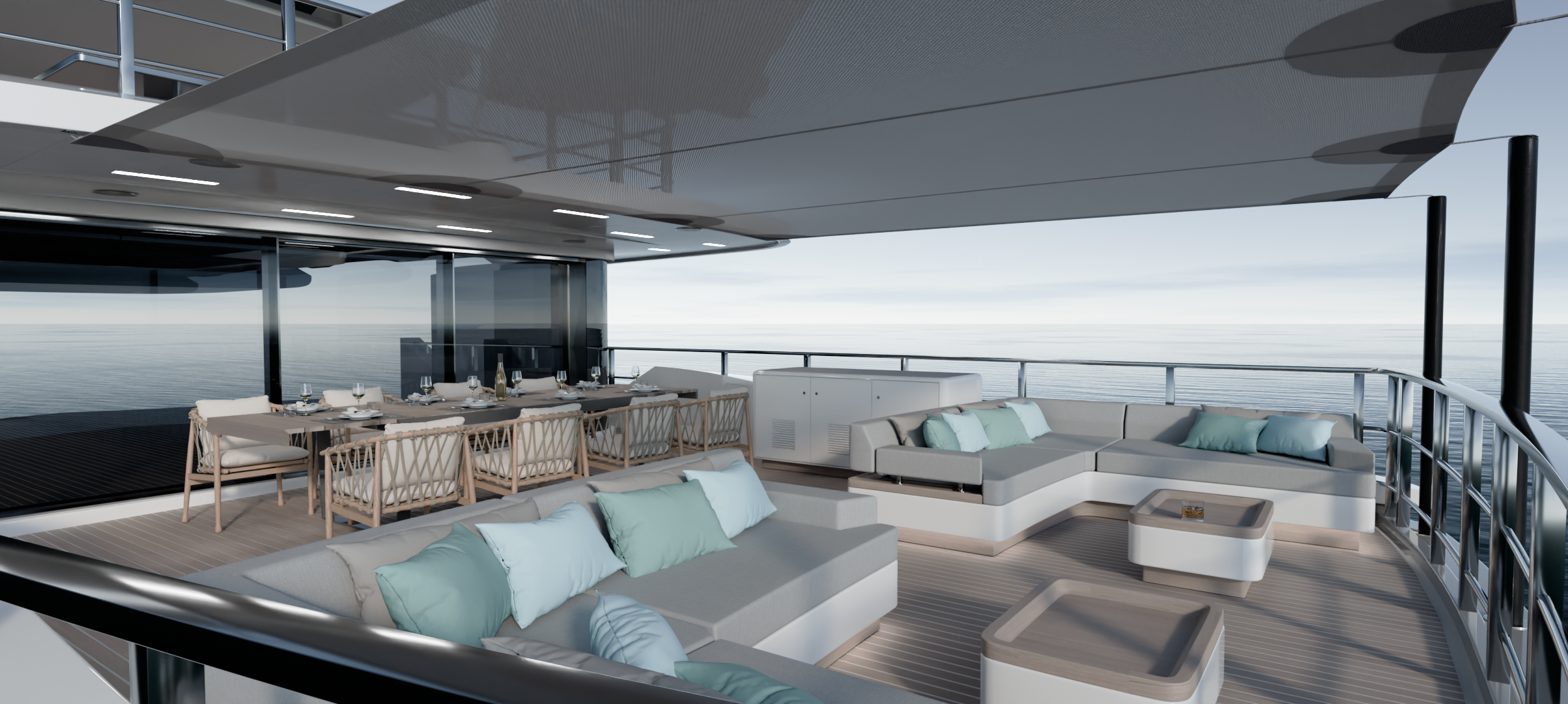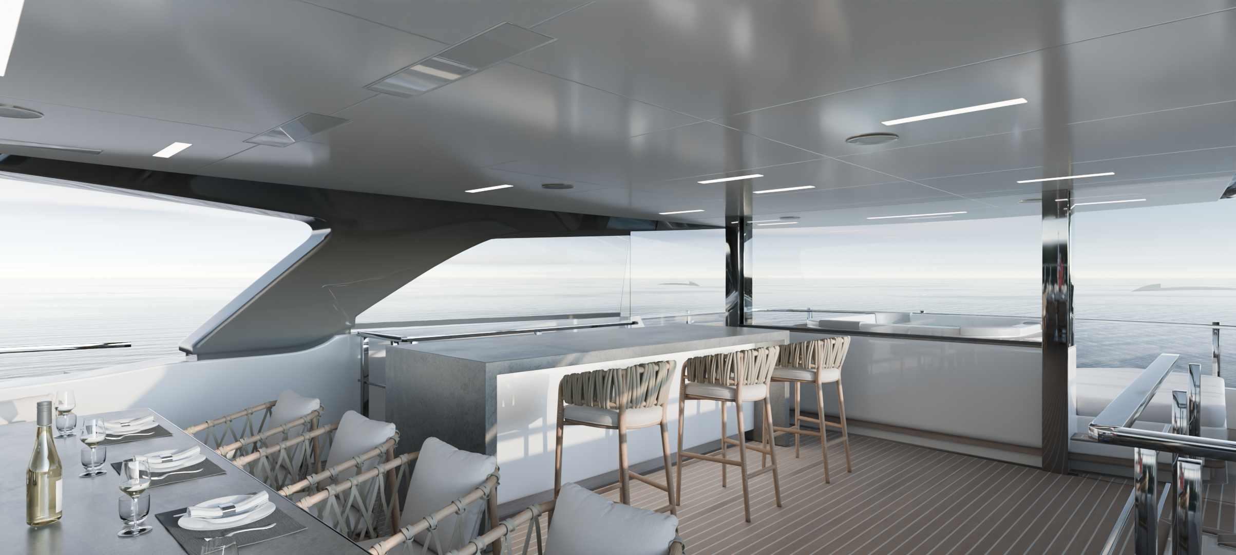 Los interiores se diseñaron con una cuidada combinación de maderas nobles, textiles neutros y detalles en tonos suaves, aportando calidez y sofisticación sin renunciar a la practicidad requerida en un entorno náutico, en línea con el estilo que actualmente tiene el barco. Las áreas exteriores se concibieron como auténticos espacios de relax y socialización, integrando zonas de comedor, solárium y jacuzzi con una estética limpia y atemporal.